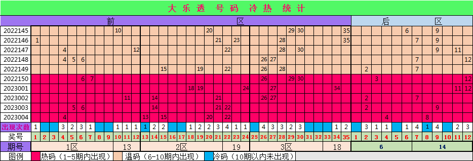 上期开出后区奖号04、08,目前后区热码有02、03、04、07、08、09、11、12,温码有06,冷码01、05、10,近期后区热码、温码出现频繁,作为重点关注