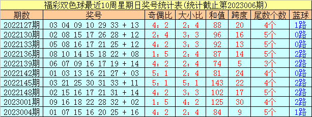 上期开奖:福彩双色球第2023006期奖号为:02、10、12、14、24、26+05,其中红球奖号奇偶比为0:6,大小比为2:4,和值为88,跨度为24,包含同尾红球02 12、14 24,蓝球开出2路奖号。