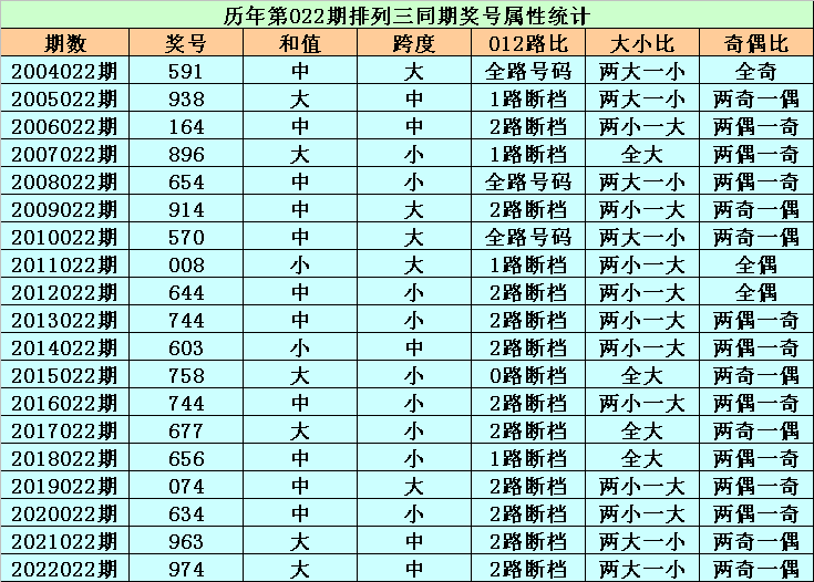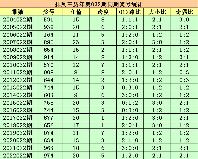 历史上第2023022期排列三已开出19期奖号了,历年同期奖号分别为:591、938、164、896、654、914、570、008、644、744、603、758、744、677、656、074、634、963、974,详细统计见下表: