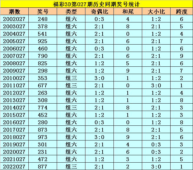 福彩3D历年第027期同期奖号为:248 378 541 925 460 790 825 298 353 677 263 308 774 452 280 873 973 301 231 472 877。