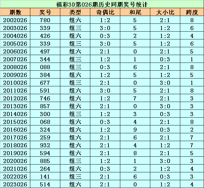 福彩3D历年第026期同期奖号为:780 339 426 339 497 344 088 384 677 591 746 857 300 068 324 259 932 594 885 264 141 514。