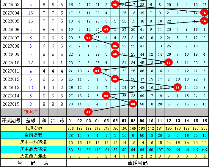 蓝球分析:前5期蓝球号码分别开出:04、06、13、05、08,其中奇数蓝球出现了2次,走势较冷,本期适当关注奇数蓝球回补,看好蓝球号码03。