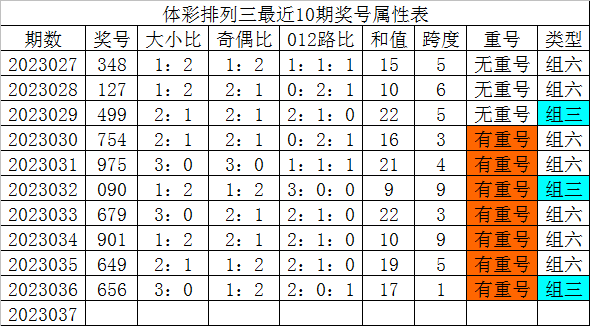 体彩排列三最近10期分别开出奖号:348、127、499、754、975、090、679、901、649、656,各奖号属性详见下表:
