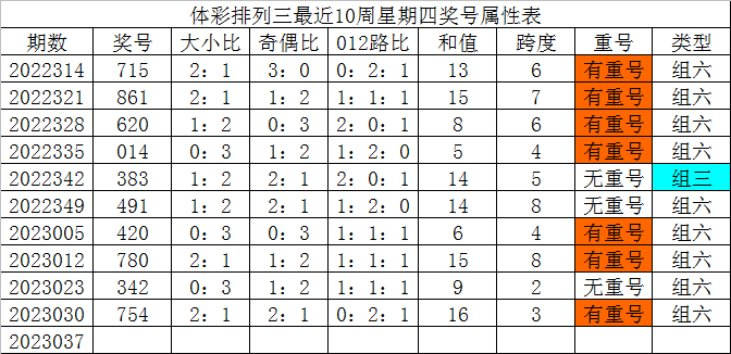 体彩排列三最近10周星期四奖号分别为:715、861、620、014、383、491、420、780、342、754,各奖号属性详见下表: