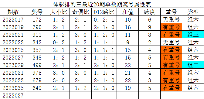 体彩排列三最近20期单数期奖号分别为:172、790、911、342、357、348、499、975、679、649,各期奖号详细属性下表: