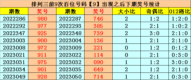 在百位前9次出现号码9之后,下期百位分别开出奖号:7-3-7-1-2-1-0-6-7,其中开出号码个数奇偶比是6:3,大小比是4:5,012路比是3:5:1。