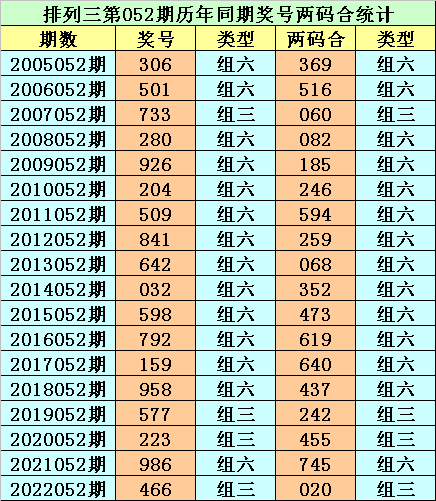 排列三从2004年开奖至今已开出6472期奖号了,其中第052期历史同期奖号出现18次,历年第052期分别开出号码:306、501、733、280、926、204、509、841、642、032、598、792、159、958、577、223、986、466。