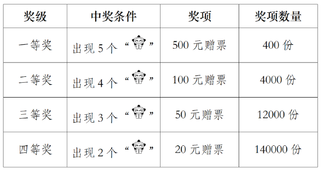 本次活动共设置四个奖级,一至四等奖分别对应为:500元、100元、50元、20元赠票(注意:不得兑换竞猜型游戏),长票票面营销区共打印8个图形,如当中出现5个“乐小星”标志即中得本次“集星”活动一等奖,可获500元赠票,详见下表: