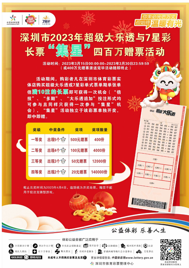 活动期间(3月15日-3月30日),购彩者凡在深圳区域实体店购买超级大乐透或7星彩单式票单期单张单倍满10注的长票即可获得一次“集星”机会。“集星”活动单独开奖,即中即赠。赠票需在4月4日前在体彩实体店进行兑付,逾期视为弃奖。活动总赠票金额为400万元,如在3月30日前提前赠完,则活动提前结束。