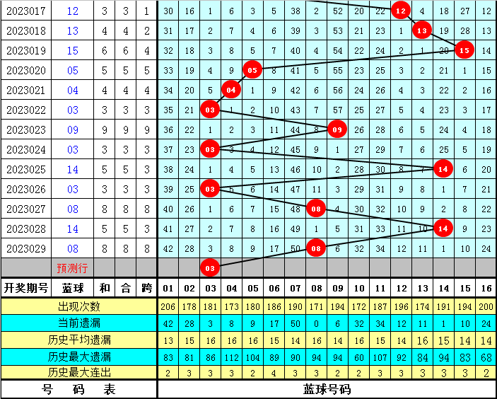 六号球:近5期尾数分别为:2、3、3、2、3,其中同尾数为2、3,全为小尾数;近10期尾数为:7、7、1、5、8、2、3、3、2、3,其中0、4、6、9尾数没有出现,尾数奇偶比为7:3,本期看好偶数尾数出现,关注红球24。