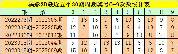 上期回顾:福彩3D第2023069期奖号为074,奖号类型为组六,奇偶比为1:2,大小比为1:2。