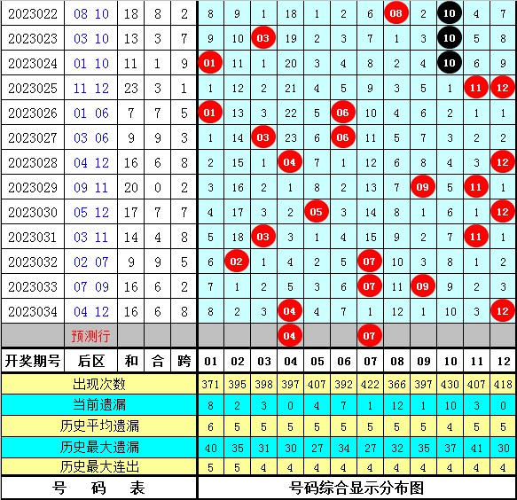后区号码频次:号码06历史上没有出现,07、08号码开出频次最高,共出现5次。