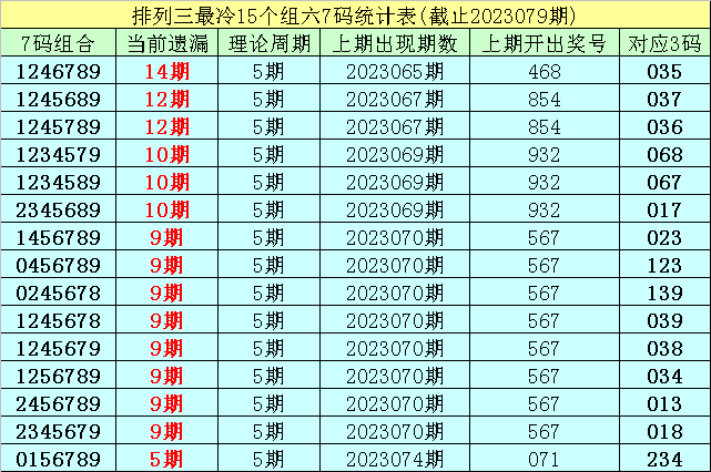(1)在排列三已开出的6500期奖号中(统计截止第2023079期),目前7码组六遗漏值最大的组合为:1246789,本期遗漏14期;