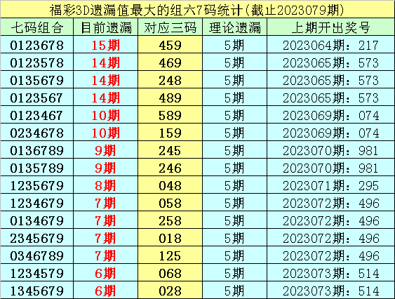 1.截止第23079期,七码组六遗漏最大的是:0123678,当前遗漏15期。