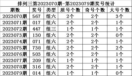 上期回顾:排列三第2023079期开奖:014,质合比为1:2,奇偶比为0:3,大小比为1:2。