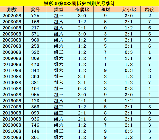 福彩3D历年第088期同期奖号为:775 168 217 571 960 258 322 809 470 342 363 381 404 955 473 366 099 936 746 144 261。