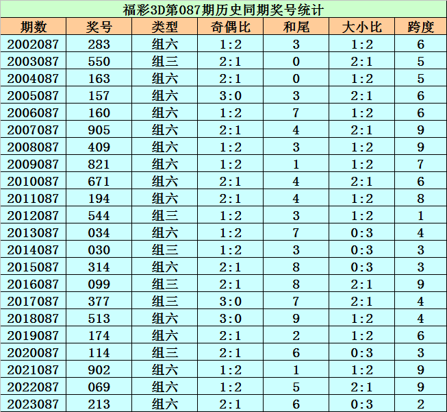 福彩3D历年第087期同期奖号为:283 550 163 157 160 905 409 821 671 194 544 034 030 314 099 377 513 174 114 902 069 213。