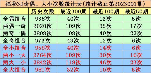 奇偶、大小分析:在最近50期开奖中,全偶组合开出5次,当前遗漏11期、两偶一奇组合开出17次,当前遗漏1期、两奇一偶组合开出22次,当前遗漏0期、全奇组合开出6次,当前遗漏23期,本期注意两偶一奇组合;全大组合出现5期,当前轮空6期、全小组合出现6期,当前轮空2期、两小一大组合出现16期,当前轮空1期、两大一小组合出现23期,当前轮空0期,本期看好开出两大一小组合。