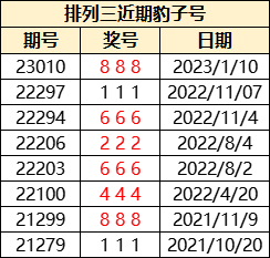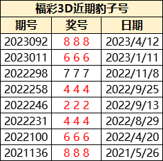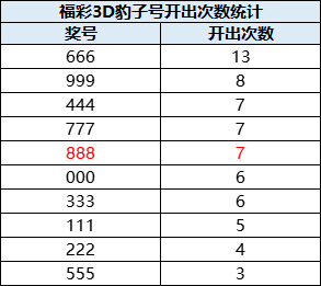 截至目前,福彩3D豹子号历史共已开出66次,其中"666"为最热号码,共开出过13次位列第一,"999"开出8次排名次席,而本次的"888"是第7次开出,与同样开出7次的"444"和"777"并列第三。