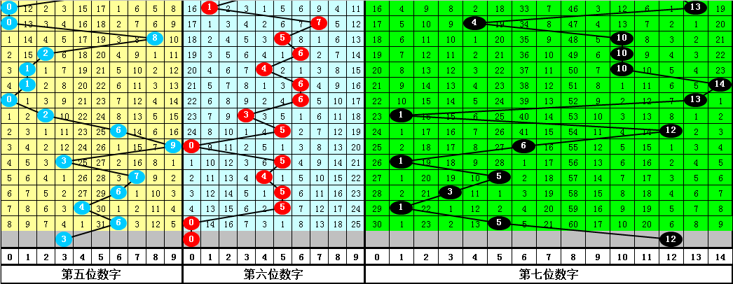 在以上10次下期奖号中,前区0-9号码出现频次分别为:号码0、6出现8次,号码7、8出现7次,号码1、2、5出现6次,号码3、4、9出现4次,其中第5位号码奇偶比为6:4,大小比为7:3,012路比为3:4:3,本期第5位关注奇数号码,参考号码379。