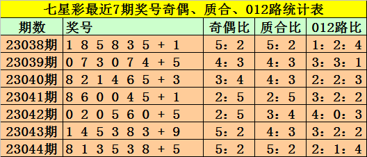 七星彩第23044期开奖回顾:奖号813538+5,前区号码奇偶比为4:2,012路比为2:1:3,质合比为4:2。