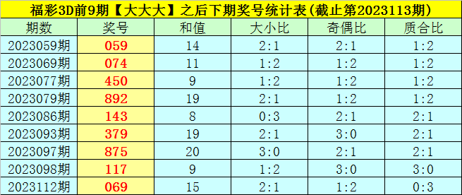 2、奖号质合比分别开出:2:1、1:2、0:3、1:2、1:2、0:3、3:0、2:1、1:2,总质合比开出11:16,其中有4期奖号质合比和上期奖号质合比相等;