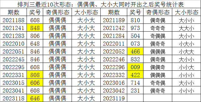 排列三最近10次同时开出奇偶形态:偶偶偶和大小形态:大小大时其奖号分别为:608-848-806-648-846-846-608-808-606-608-646,下期分别开出号码为:810-973-504-073-466-832-009-422-714-231,详细统计见下表:
