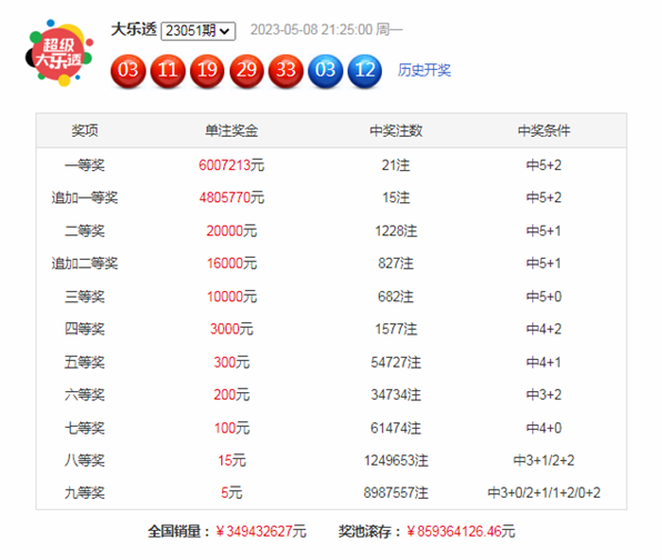 上期开奖:体彩大乐透第23051期开奖号码:03 11 19 29 33+03 12,前区和值:95,跨度:30,奇偶比:5:0,大小比:3:2,五区比:1:1:1:0:2,没有出现重号。