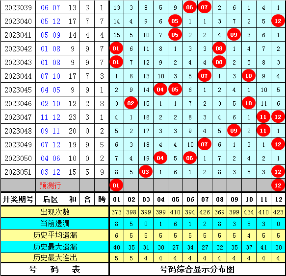 后区分析:后区上期开出号码03+12,和值为15,跨度为9。最近10区后一区(01-06)开出8个号码,断区4次,后二区(07-12)开出12个号码,断区2次,本期后一区注意号码:01、02、05;后二区注意号码:09、10、12。