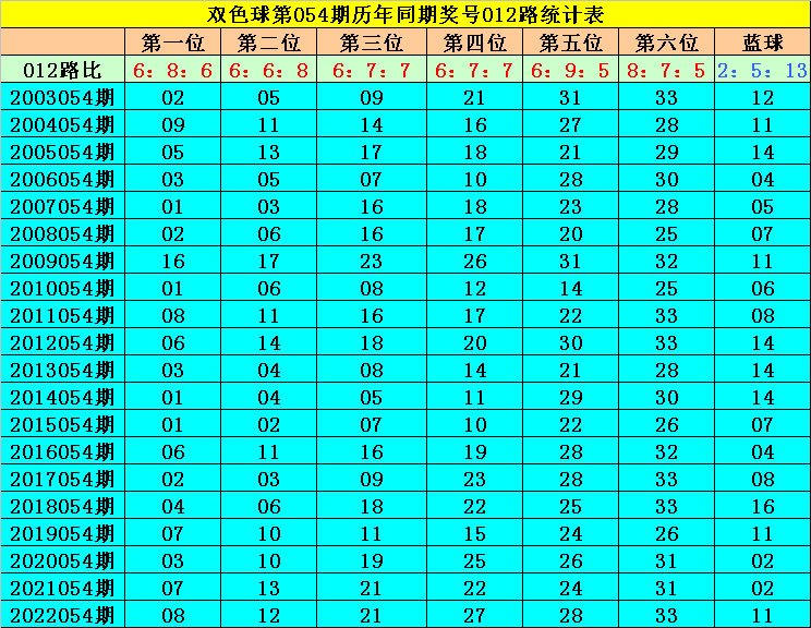 蓝球分析:在第054期历史同期开奖中,蓝球012路比为2:5:13,最近5年同期蓝球012路比为0:1:4,目前0路号码遗漏12年,今年同期排除0路蓝球,参考1路蓝球10。