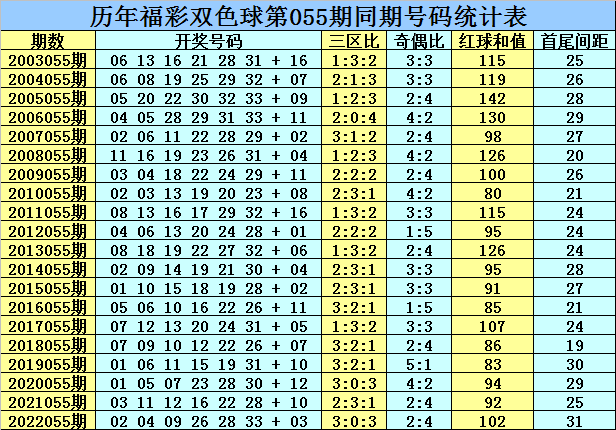 和值分析:在历年第055期开出中,红球和值出现范围在80-142区间,和值波动范围较大,其中有8期开出102以内的小和值,小和值出现次数较多,去年同期和值走小,近期同期看好和值继续走小,预计出现范围在89-99区间。