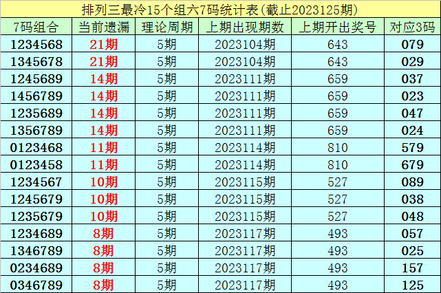 (1)在排列三已开出的6546期奖号中(统计截止第2023125期),目前7码组六遗漏值最大的组合为:1234568、1345678,本期遗漏21期;