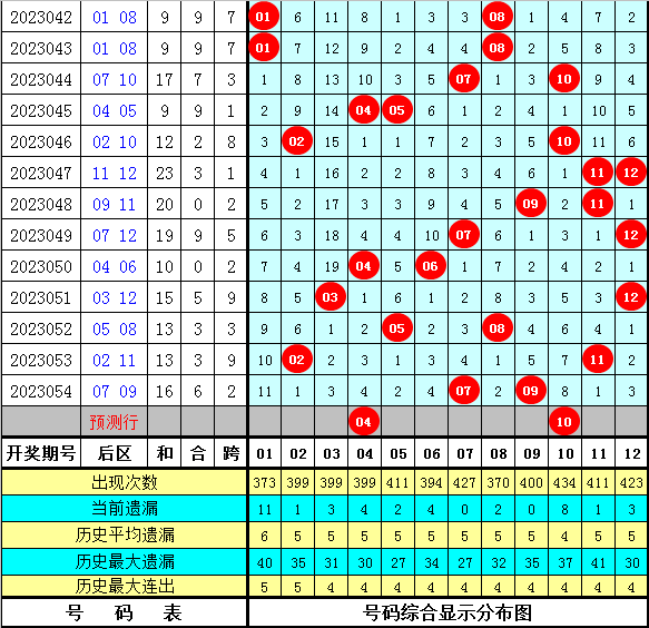 6、在历史同期第055期开奖中,后区一大一小组合出现8次,全大组合出现5次,全小组合出现3次,本期后区注意一大一小组合出现,关注号码04、10、11、12。