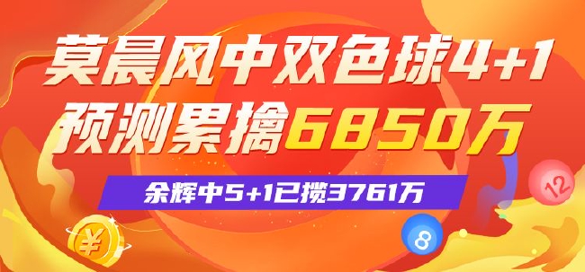 莫晨风双色球:平台第1专家,预测数字彩累计中奖6850万,此前多次预测命中大乐透、双色球头奖,第135期刚中快乐8选九30万,状态火热值得继续关注!