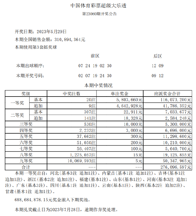 北京时间5月29日晚,体彩大乐透第23060期开奖,当期开奖号码为:前区02 07 19 24 30,后区09 12。本期全国开出一等奖20注,单注奖金580万,其中9注为追加,多得464万奖金;二等奖开出307注,单注奖金2.2万余元,其中141注采用追加投注,每注多得奖金1.8万余元。