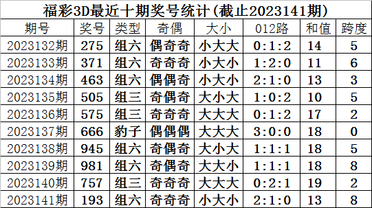 开奖回顾:福彩3D第2023141期奖号为193,奖号形态为:组六、小大小、2:1:0、奇奇奇。