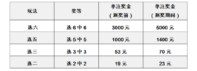 本次派奖活动由“选十中十”特别奖、“选九中九”特别奖和特定玩法奖上奖三部分组成。