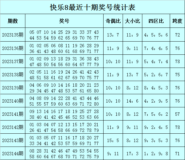 福彩快乐8第2023144期开奖回顾:08 28 31 42 46 47 49 53 54 55 58 60 64 67 68 70 71 72 75 79,其中奖号奇偶比开出9:11,大小比开出17:3,四区比开出1:2:9:8,跨度开出71。