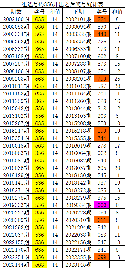 福彩3D第2023144期开出组选号码:356,该号码历史上组选出现了34次,其下期分别开出了号码:224、890、443、726、173、602、573、624、799、587、704、628、318、203、253、199、344、278、062、640、695、245、937、085、375、000、053、611、542、083、247、341、099,如图:
