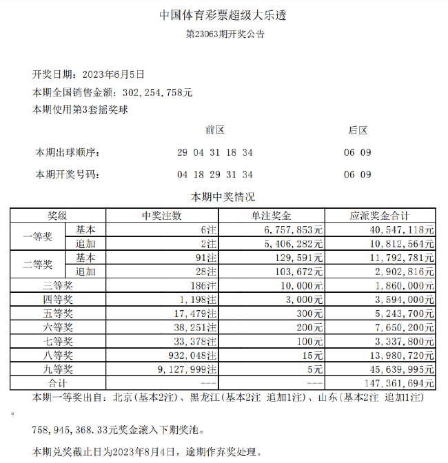 北京时间6月5日晚,体彩大乐透第23063期开奖,当期开奖号码为:前区04 18 29 31 34,后区06 09。