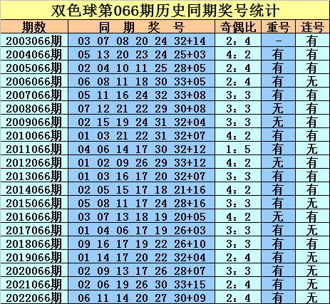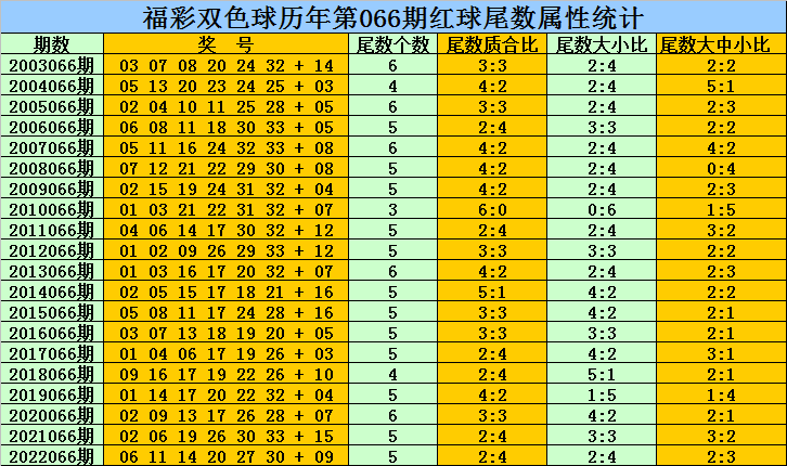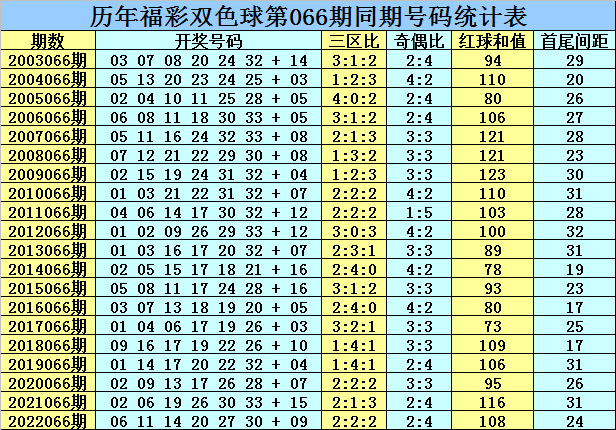 和值分析:在历年第066期开出中,红球和值出现范围在73-123区间,和值开出范围较小,其中有11期开出102以内的小和值,小和值出现频次较少,目前轮空了2年,今年同期奖号注意开出小和值,和值范围参考67-77区间。