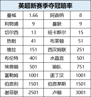 其它球队中,利物浦和曼联均为1赔9并列第三,切尔西1赔13、纽卡1赔15,热刺已高至1赔41。