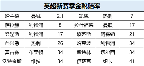 金靴赔率方面,曼城前锋哈兰德1赔2.1遥遥领先。上个赛季,哈兰德攻入36球打破英超单赛季进球纪录获得金靴奖,这还是在曼城提前夺冠进行阵容轮换的情况下,进攻能力恐怖如斯!热刺前锋凯恩1赔7第二,两人也是上赛季英超唯二攻入30球的球员。