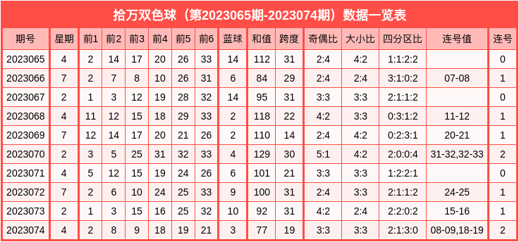 红球跨度:上期红球跨度为19,为中跨(跨度处于14-22区间属于中跨)。近10期中的跨度档位分别开出大跨6次、中跨4次,本期看好中跨开出,参考跨度17。