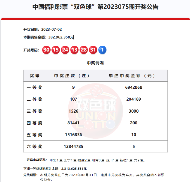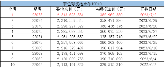 北京时间2023年7月2日,福彩双色球第23075期开奖,当期开奖号码为:红球13 15 24 28 30 31 ,蓝球01。在本期计奖结束后,双色球奖池余额升至23.13亿元,再创历史新高。