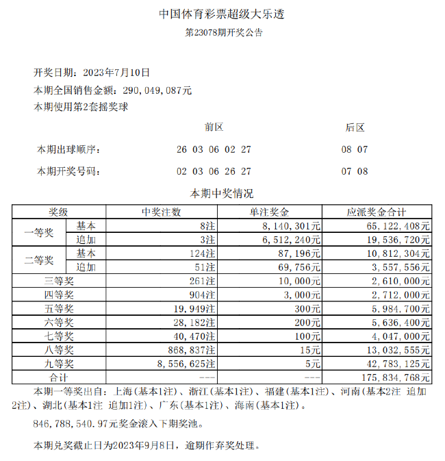 北京时间7月10日晚,体彩大乐透第23078期开奖,当期开奖号码为:前区02 03 06 26 27,后区07 08。