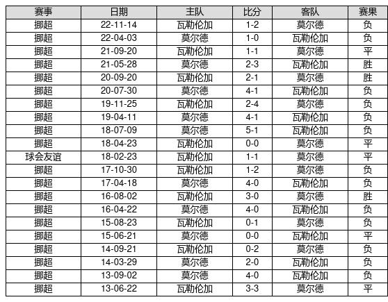 瓦勒伦加 VS 莫尔德两队近10年的交战次数为21场,瓦勒伦加3胜5平13负,赢球概率为14.3%,平局概率为23.8%,输球概率为61.9%。