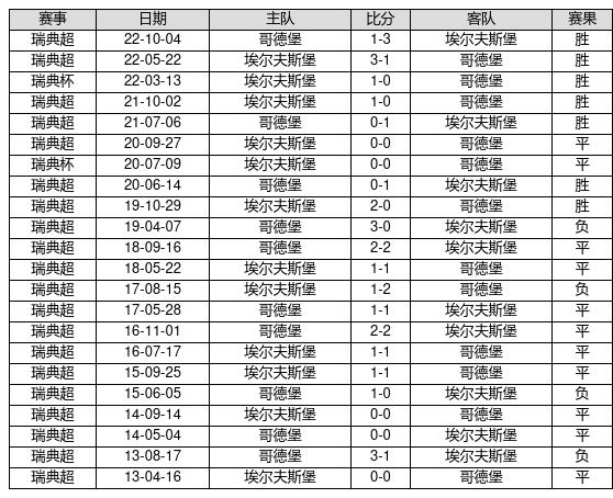埃尔夫斯堡 VS 哥德堡两队近10年的交战次数为22场,埃尔夫斯堡7胜11平4负,赢球概率为31.8%,平局概率为50%,输球概率为18.2%。