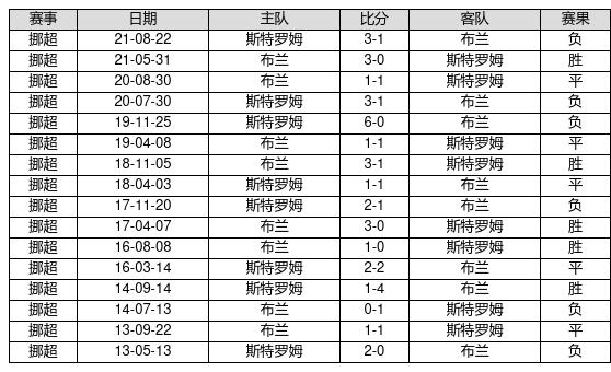布兰 VS 斯特罗姆两队近10年的交战次数为16场,布兰5胜5平6负,赢球概率为31.3%,平局概率为31.3%,输球概率为37.5%。