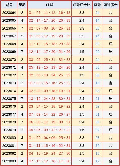 红球质合奖号:红球质合比2:4,在近1000期共出现了360次,其最近6期出现之后下期开出奖号分别为: